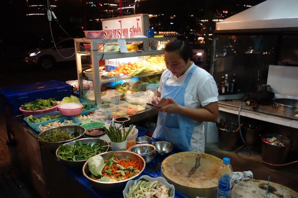 Ons hotel Naga Residence ligt in de wijken Thornburi en Riverside, heerlijk rustig net buiten het centrum, weg van alle drukte. Als we zijn opgefrist is het inmiddels al 22.00 uur en we zijn hongerig. Ons plan om naar een night food market te gaan, laten we varen bij de derde poging om een taxi chauffeur te vinden die snapt wat we bedoelen. We besluiten daarom om wat te eten in een van de vele kleine Chinees-Thaise restaurantjes in de buurt van het hotel. De keukens zijn voor en je kunt zien hoe alles vers wordt klaargemaakt.