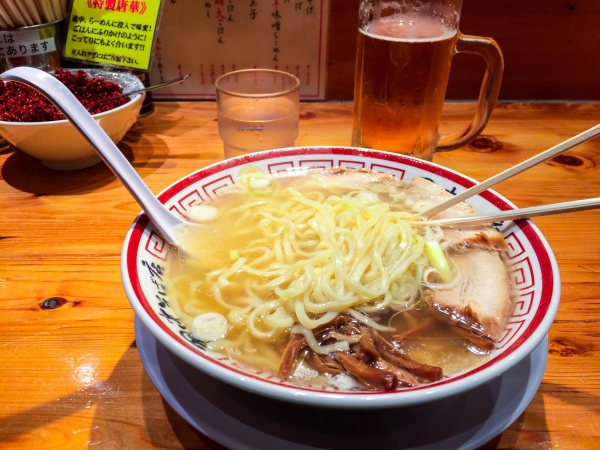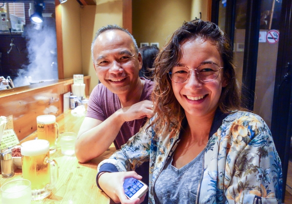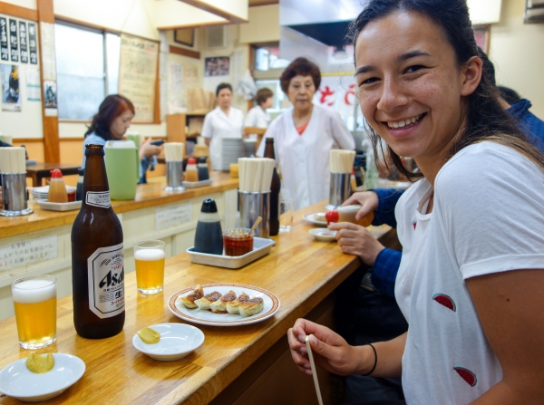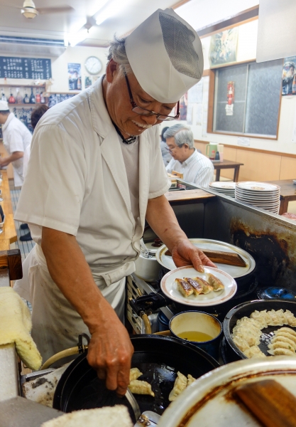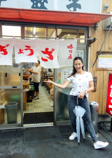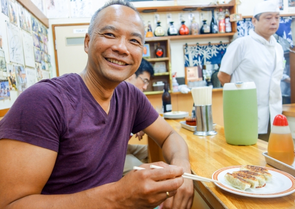 Nadat we zijn ingecheckt lopen we terug richting het metrostation om een hapje te eten. Het is lunchtijd en onze magen knorren. Hmmmm … zoveel keuze, maar we lopen bij Kameido Gyoza naar binnen waar ze volgens Foursquare de allerlekkerste dumplings van Tokyo maken. Hier is niks van gelogen. Ze serveren maar 1 gerecht: dumplings met 1 soort een vulling, maar die zijn superlekker. Ook ons eerste Japans biertje smaakte ons goed. Alle gasten worden doorhebt personeeel en de kok en die vooraan de winkel de dumplings bereid met enthousiast gejuich begroet.