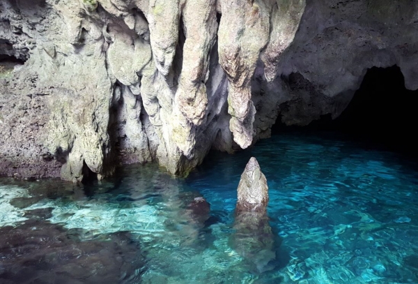 De grot bij Debut blijkt niet zo’n heel bijzondere plek, maar het ligt er mooi in het groen. Het lijkt een beetje een groot muil met lange tanden, met als tong het helderste water dat ik ooit heb gezien.