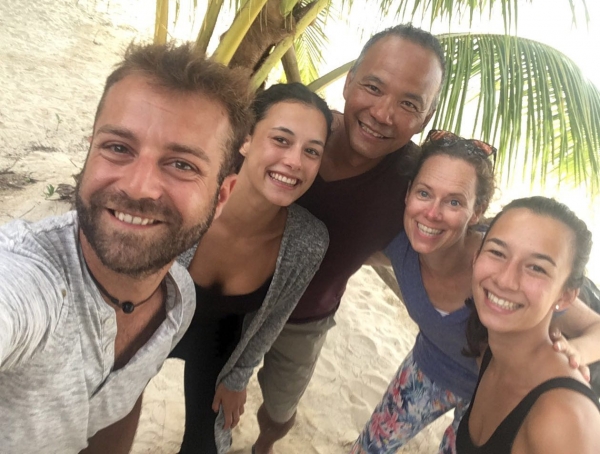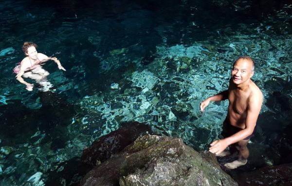 Giorgio, Jerrel en ik nemen een duik, zoals een aantal locals. Het is toch wel spannend om wat dieper de grot in te zwemmen, hoewel het eigenlijk al vrij snel doodloopt.