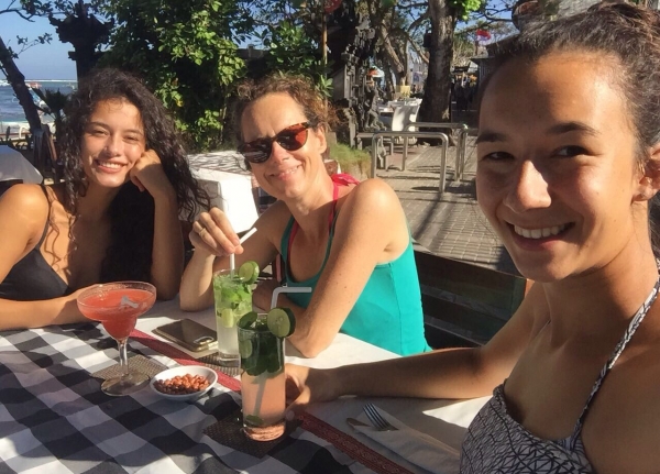 Sanur is genoeglijk, warm, met een heerlijk windje aan het strand. En als we aankomen, nemen we het er een dagje van. Eerst de luxe van een warme hete douche en daarna chillen aan het strand. Yara, Noa en ik nemen een exotische cocktail op een terrasje en zitten ineens als figuranten in een opname van een reality show. De showmaster (volgens de cameraman, de bekendste van Indonesië) speelt zelf ook mee. Wij flippen ons haar een keer extra naar de ander kant en genieten van alle commotie en drukte om ons heen. We komen op tv!