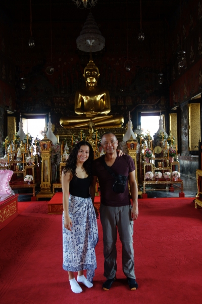 “Come in, but take your shows off”, zegt een man die in de tempel op zijn knieën zit. Hij is klaar met bidden. Hij introduceert zich in goed Engels als een leraar op een middelbare school vlakbij in de buurt. Ook hij stelt ons de gebruikelijke vragen. We hebben volgens hem pech met het weer, maar ook met de timing omdat de Thais nu twee weken vakantie hebben en men massaal naar Ko Samui gaat. De prijzen van vliegtickets en hotels schieten daardoor omhoog. We zullen waarschijnlijk overal de hoogste prijs moeten betalen. Hij tipt ons om onze tickets en hotels te boeken waar de lokalen mensen dat doen: ITAT. De zelfde naam dat ook op ons briefje van de politieagent staat. We maken in de tempel wat foto’s en als we naar buiten lopen staat de tuk-tuk chauffeur ons bij de deur op wachten. We treuzelen om buiten de tempel nog wat rond te kijken en plaatjes te schieten. Hij komt ons vervolgens zoeken als het hem iets te lang duurt.