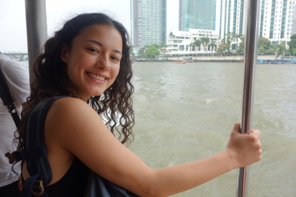 We haasten ons naar de Sathon pier voor de hop-on hop-off boot. Onze eerste bestemming: Wat Pra en the Grand Palace. We kopen heerlijke bakbanaantjes met sesam als verlate ontbijt zo uit het vuistje. We stappen uit de boot op de Maharajah pier en wandelen richting het paleizen- en tempelcomplex. Noa wil nog een verse mango smoothie en ik kan de verleiding niet weerstaan om een durian ijsje te kopen. Op dat moment begint het heel hard te regenen.