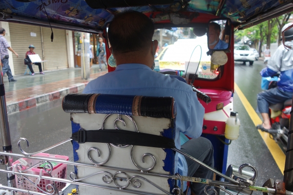 “Het is beter om pas tegen 15.00 uur naar binnen te gaan want dan is het minder druk” zegt hij. Klinkt aannemelijk. Hij tipt ons om eerst een bezoek te bergen aan de Golden Mountain tempel. “Vandaag is de laatste dag dat de tempel open is”. Is dit ons geluksdag? Hij biedt vervolgens aan om tuk-tuk, een bromfiets taxi met een cabine achterop, te regelen. Een blauwe tuk-tuk die door de overheid wordt gereguleerd. De tuk-tuk brengt ons dan erheen, wacht op ons wacht en brengt ons weer op tijd terug. Dat allemaal voor slechts 150 Bath (4 euro). O ja, hij wil ons ook aan een adres helpen van een officieel toerisme bureau, ITAT. Hier boeken volgens hem de lokale Thais hun reizen, uiteraard tegen lagere prijzen dan toeristen normaal betalen. Op dat moment wordt ik argwanend. Maar de Golden Mountain willen we wel zien. De politieman schrijft voor ons alles op een briefje zowel in het Engels als het Thais. Het briefje blijkt uiteindelijk te zijn bedoeld voor acteur nummer 2, de tuk-tuk chauffeur. Deze staat iets verderop staat te wachten om mee te doen aan het toneelstukje.