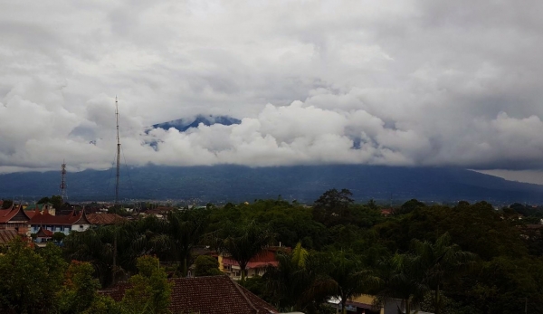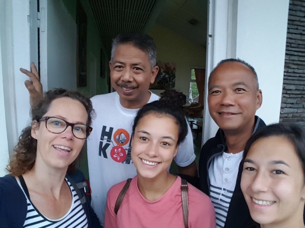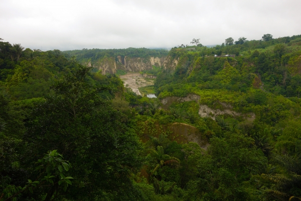 Overal om ons heen is de jungle te zien. Tussen en achter de huizen, op de stijle rotsen, diepe ravijnen, wild stromende riviertjes en watervallen die zomaar in een bocht van de weg verschijnen. Ik kijk mijn ogen uit tot het donker wordt en we bij Hotel Sumatera arriveren. Een eenvoudig hotel, met een topligging vlakbij het centrum en een vriendelijke eigenaar, Jimmy, die ons al snel een hele sloot tips geeft en zijn beste kamer met uitzicht op de Marapi en Sangalong (2 actieve vulkanen) plus het omringende gebergte. Boven onze kamer ligt het dakterras vanwaar het uitzicht nog mooier is.. 1 addertje onder het gras..de ladder ernaartoe is nogal..Indonesisch!!