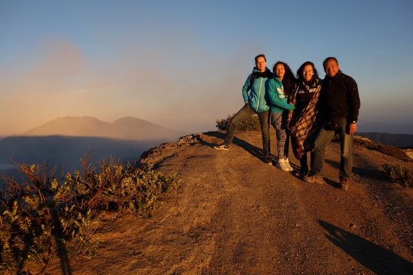 Na ongeveer een uur klimmen begint de wind aan te trekken en zijn we op de kraterrand aangekomen. Een soort maanlandschap verschijnt voor onze zaklamp, het ruikt ook wat zwavelig. Rechts en links van ons niets dan zwarte leegte.. We lopen duidelijk op de rand, maar hoe hoog of enige andere oriëntatie is onmogelijk. Dan valt midden in de duisternis mijn blik op het blauwe vuur… Onaards. Dan dalen we af,voetje voor voetje van rots naar rots en over rollend puin, onderwijl de zwaveldragers de ruimte gevend die ons passeren met 80 kg aan zwavel in twee manden over de schouders. De klim omlaag is spannend en ik heb het idee dat als we dit in het licht hadden gezien, dat we er niet over zouden peinzen om dit te doen. Beneden aangekomen is het natuurfenomeen overweldigend. Het licht, de kracht, het geluid en de geur zijn allemaal even intens. Overweldigend. Fascinerend!!
