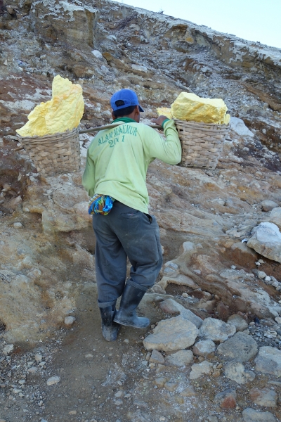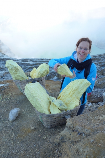 Ik daal nog iets verder af voorzien van gasmasker. Tot ik letterlijk de vloeibare zwavel zie druppelen en kristalliseren op de bodem. Donker oranje glanzend zwavel. Dikke wolken zwaveldamp stijgen voor mijn ingepakte neus op. Gelukkig staat de wind goed en drijven de gassen van ons vandaan. Neemt niet weg dat rochet me zo af en toe beet pakt en wegtrekt als er een wolk onze kant op komt. Een kort sprintje een rotsblok omhoog en wachten tot de dampen weer de andere kant opwaaien. Wat prikt dat spul aan de ogen.. Rochet laat nog even zien hoe het zwavel word verwijderd door met een enorme speer in het zwavel te hakken. Indrukwekkend. Een zwaveldrager naast me, vult zijn mand en heeft enkel een natte prop in zijn mond ter bescherming. Even voel ik me belachelijk en een echte toerist en dus haal ik mijn masker iets van mijn neus… Ok, dit is niet voor beginners! Masker op en na wat souvenirs te hebben geraapt volgt ik het pad naar boven.