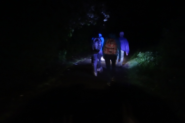 De ijle lucht denk ik nog, maar 300 m als het zweet me over de rug loopt en mijn eigen gehijg als een oude uitlaat in de stilte weergalmt begin ik toch te vermoeden dat het pad stijler is dan we denken. We zien niet veel meer dan de een of twee meter voor onze voeten, die door onze zaklampen worden verlicht. Ben benieuwd wat we straks te zien krijgen als het licht is. ‘Slowly’ maant Rochet ons. Bijna dubbel gevouwen lopen we voetje voor voetje omhoog. One kilo, zegt Rochet.. Hij bedoeld nog 1 km, maar na een tijdje merken we dat hoe ver we ook lopen, het nog steeds 1 km is en daarna weer 1 km.