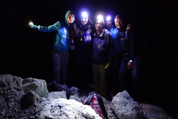 De ijle lucht denk ik nog, maar 300 m als het zweet me over de rug loopt en mijn eigen gehijg als een oude uitlaat in de stilte weergalmt begin ik toch te vermoeden dat het pad stijler is dan we denken. We zien niet veel meer dan de een of twee meter voor onze voeten, die door onze zaklampen worden verlicht. Ben benieuwd wat we straks te zien krijgen als het licht is. ‘Slowly’ maant Rochet ons. Bijna dubbel gevouwen lopen we voetje voor voetje omhoog. One kilo, zegt Rochet.. Hij bedoeld nog 1 km, maar na een tijdje merken we dat hoe ver we ook lopen, het nog steeds 1 km is en daarna weer 1 km.