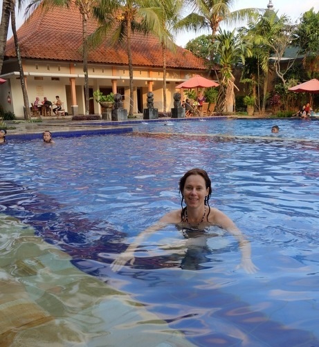De Ferry is een verademing. Even geen druk verkeer, getoeter of gedoe. Nee, de zeewind in het haar en zachtjes wiegend over de golven in 30 minuten naar de overkant, waar we met een Japanner en een Belgisch gezin een busje regelen en naar Lovina worden gebracht. Hotel Suma in Lovina is onze stop de komende dagen.
