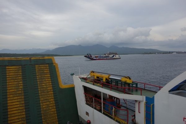 In de trein valt ons de luxe op: airco, ruime stoelen, pluche, tv, voetsteunen, getinte ramen..wauw, reizen met de trein is prima! Tot de conducteur komt.. We zitten verkeerd, of we even een wagon of 4 naar voren willen gaan. Ons ticket is business class, niet executive class ..? .. Verplaatsen dus. En dan komen we inderdaad in een simpelere wagon. Nog steeds prima, want het is slechts anderhalf uur en het Javaanse landschap zorgt voor afleiding. Voor we het weten zijn we op het station in Banyuwangi en pakken we een taxi die ons naar de haven brengt. 400 m verderop zijn we bij de haven.. Hihi, we snapten al niet dat de betjak ons wilde brengen of dat ze dachten dat we zouden lopen….
