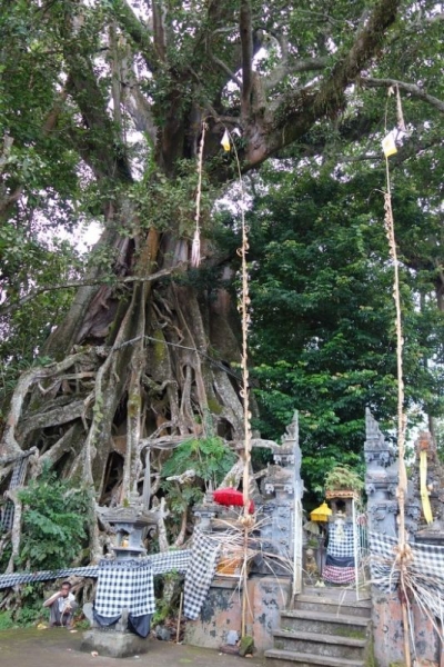 Onze eerste dag in Munduk start met het openen van de gordijnen en het openslaan van de terrasdeuren, recht voor ons hemelbed (met romantische klamboe). Een waanzinnig mooi landschap van weelderig beboste heuvels en felgroene rijstvelden ligt aan onze voeten. Even is het stil en laten we het geheel op ons inwerken. Mistflarden liggen tussen de heuvels en de uitlopers van de vulkaan. Als je inspiratie zoekt, dan hoeft je niet verder te gaan. Dan komen echter de geluiden van het dorp tevoorschijn. Tientallen hanen kraaien dat het een lieve lust is, een hond blaft en de vogels fluiten. Verder niets.. Heerlijk weg van de (toeristische) drukte. We ontbijten in de open lucht en genieten van de verse sapjes. Dan verruilen we de slippers voor de sneakers en trekken we erop uit richting de oudste Banyan boom van Bali. Eigenlijk gewoon een kamerplant. Een ficus. Ben benieuwd waarom deze zo bekend is.