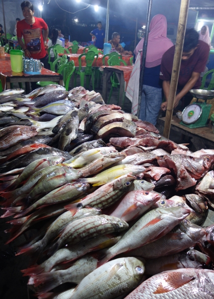 Noa loodst ons met behulp van Maps.me naar de Ikan Bakar aan de rand van het busstation. Hier kiezen we een paar verse vissen die voor onze neuzen worden schoongemaakt en gegrild. Daarna krijgen we een heus feestmaal voorgezet. Het enige dat we niet aandurven is de verse limoenlimonade aangelengd met water en ijs.