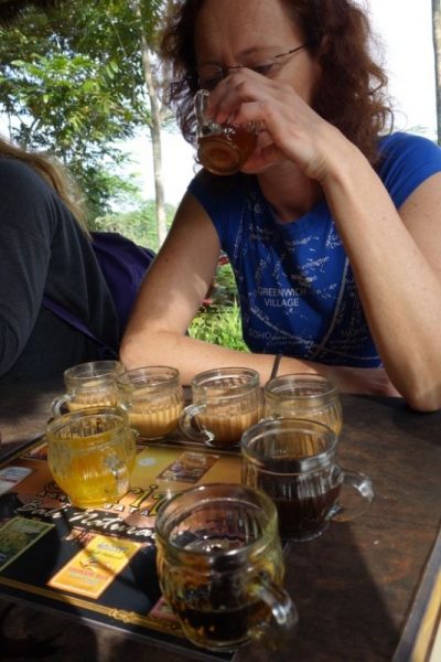 We krijgen een rondleiding met uitleg over de verschillende planten en kruiden die Op Bali worden verbouwd. We zien zelfs de Luwak (kat,vos,beer, niemand schijnt te weten wat voor soort het is, maar het beest eet koffiebonen en poept ze weer uit… Die bonen worden gewassen, gedroogd en gebrand en zie daar..Luwakkoffie). Aansluitend is er een koffie en thee proeverij en de Luwakkoffie is verrassend lekker. Kattenpoepkoffiebonen.. Wie heeft ooit bedacht dat je hiervan nog iets lekkers kan maken?
