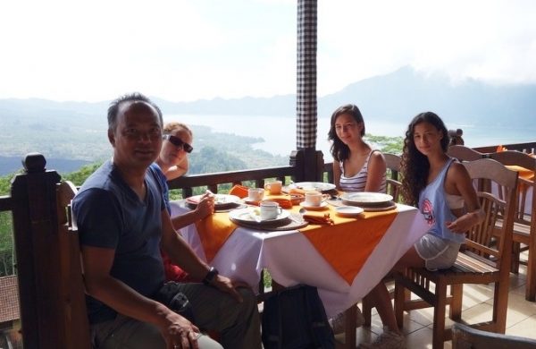 Dan is het tijd voor ons ontbijt op de kraterrand van de Batur. Het uitzicht is fantastisch en de lavastromen zijn indrukwekkend. Als de eerste tourbussen het terrein van ons restaurant oprijden, vertrekken wij naar het startpunt van onze tour. Helm op, flinke laag zonnebrandcreme, fles water en hup we sjezen bult af..en dat blijft zo de komende 23 km! Het enige dat we daadwerkelijk nodig hebben van onze fiets is de handrem, zo heftig dat ik er handkramp van krijg (de zadelpijn volgt iets later).