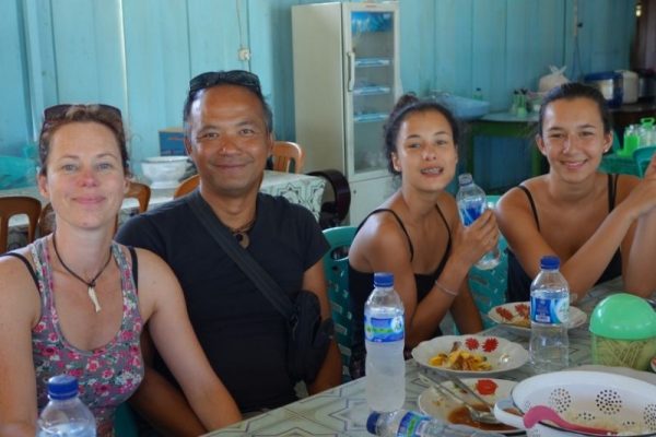 Ze pikt ons op in de haven, want tja, ze wist dat we vandaag zouden terugkeren. Ze heeft al een busje geregeld voor ons vervoer en met een technodreun door de speakers en de ramen wijd open, regelt ze al rijdend door het dorp en roepend vanuit de auto, een chauffeur voor de rit naar Tentena. Petra en Rem, 2 Brabanders sluiten zich bij ons aan. Chauffeur is geregeld maar voor vertrek gaan we eerst wat eten. Dat blijkt lastiger dan we denken. Het is ramadan en dus zijn de meeste warungs gesloten. We worden afgezet bij een schuur (waarschijnlijk familie van de vrouw die ons afzet) en voor we het weten zitten we binnen aan een tafel met heerlijk gebakken kip en schalen met groente, rijst en kroepoek. En voor het eerst sinds lang, ijskoud water…mmmm, zalig! Na een paar dagen op zee, met bijbehorend briesje, is het hier aan land snikheet!