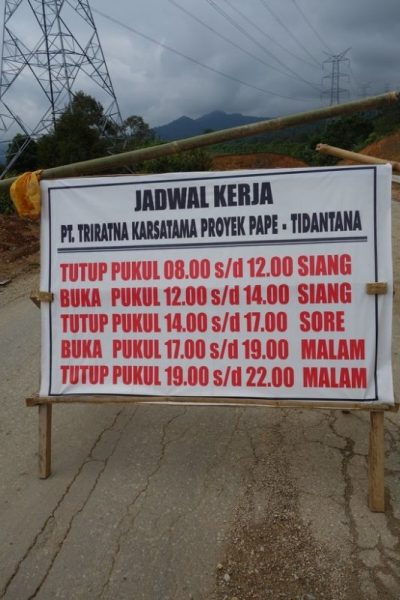 Met Ones, onze nieuwe chauffeur, beginnen we aan de volgende, lange etappe. Vandaag de rit van Tentena naar Rantepao. Het zijn niet de kilometers die tellen, maar de route. Een en al bergweg, de enige weg.. En dat merken we na nog geen 2 uur rijden. We sluiten aan in een file ergens bovenop een berg achter Palopo. De mensen staan, zitten en hangen naast hun auto’s en vrachtwagens en het ziet er naar uit dat ze daar al een tijdje zijn. Als Jerrel en ik naar voren lopen om te zien wat er loos is, stuiten we op een bord met de volgende aankondiging: wegwerkzaamheden. Gesloten van 08.00-12.00. Open van 12.00-14.00 . Gesloten 14.00-17.00 etcetera.