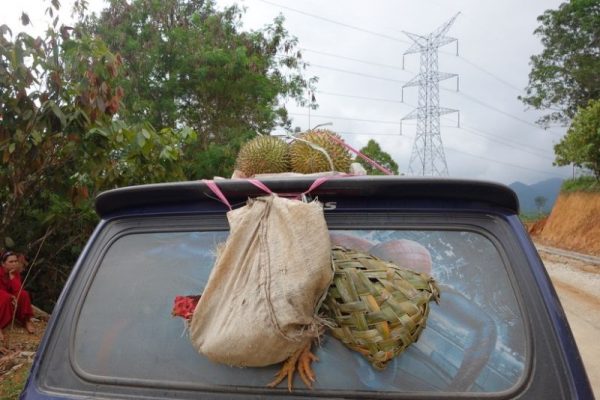 Een man wast zijn haan in een plas om deze vervolgens in een boodschappentas te zetten. Een ander verzorgt de drie buffels achterin een open truck. Bovenop een busje ligt durian en Jerrel overweegt het ding over te kopen. Dat ding ligt echter niet voor niets op het dak, het stinkt zo erg dat je het meters verderop nog ruikt. Dan maar een duriansnoepje, die jerrel nog in zijn tas in de auto heeft. Het effect is hetzelfde. Wat een stank! Jerrel eet buiten de auto verder, alleen.