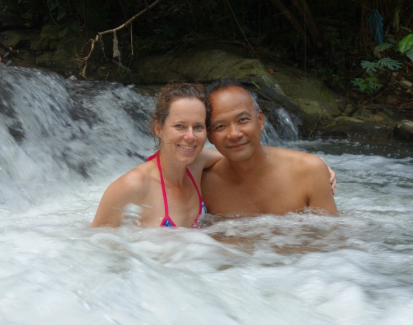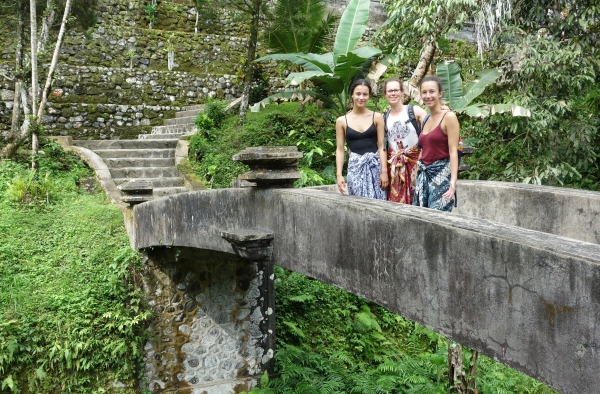 Als toetje bezoeken we de Bangun Lemah Ampuan waterval met iets stroomafwaarts een heilige bron. Dit lijkt nog onontdekt door de toeristen. We zijn er het enige groepje en spetteren lekker rond onder de waterval. Een stukje wandelen (of eigenlijk klimmen we 200 treden op en weer neer) dompelen we ons nog een keer onder in het heilige water, waar een oude man haastig zijn zwembroek aantrekt.
