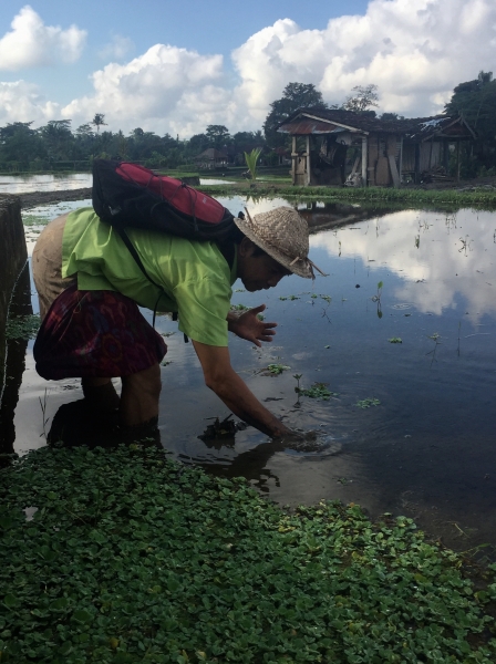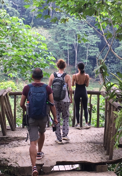 We starten onder leiding van een lokale gids in de groene rijstvelden bij Keliki ten noorden van Ubud. Een mooi gebied, waar we tekst en uitleg krijgen over de irrigatie en verbouw van rijst. Hij vertelt ook vol passie over de verschillende p kruiden, insecten en dieren die er voorkomen alsook wat ze beteken voor de Balinese cultuur en geloof.