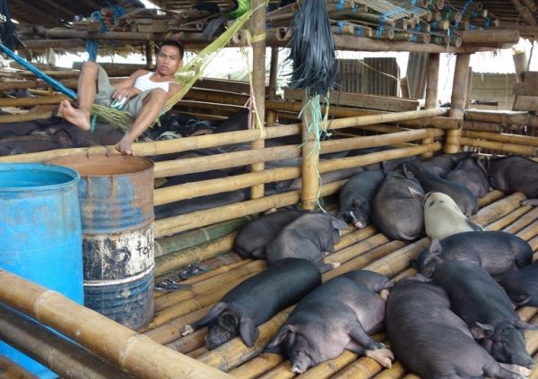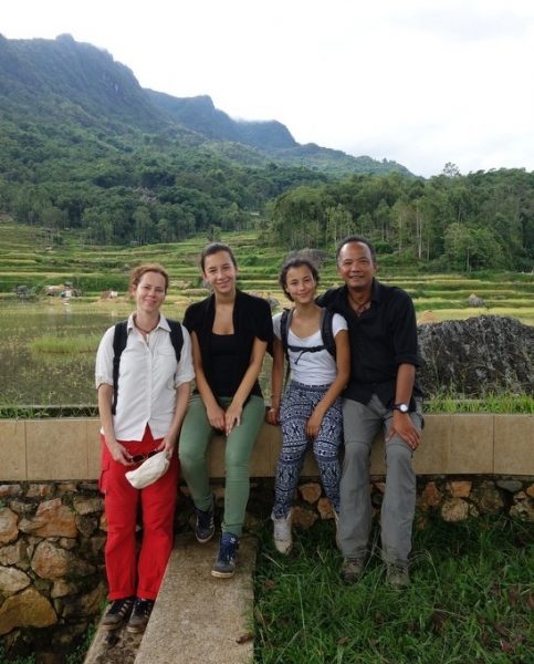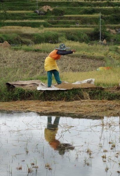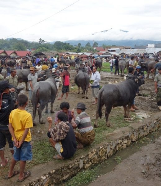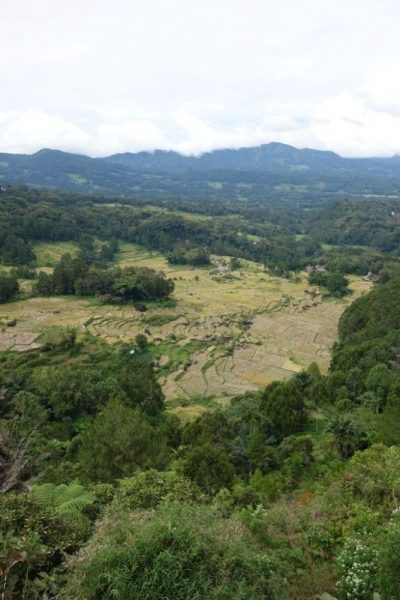 Honderden buffels staan op het veld en de straten, enorme bamboe varkensstallen even verop en overal mannen met kruiwagens die een varken hebben gekocht, sommigen vervoeren het varken achterop de brommer. Het verbaast ons niet meer, maar het blijft een gek gezicht. We kijken onze ogen uit en knijpen de neus dicht. De vis en groentemarkt zijn eens zo groot. ‘Vandaag niet zo druk, door regen.’ Zegt Yohanis even later.. Ik kijk om me heen en kan me niet voorstellen dat het op een zonnige dag nog drukker is. Je kunt over de hoofden lopen en de file buiten de markt is indrukwekkend. Toch lukt het om vrij snel de markt te verlaten en we rijden in een 8 persoons auto, gevuld met 13 mensen de stad uit. We gaan wandelen in de rijstvelden even ten Noorden van de stad. Als we uitstappen schijnt de zon uitbundig over de sawa’s. We zien het Indonesië uit de brochure. Links en rechts zijn er mensen aan het werk in de velden en snijden de rijst en binden het tot kleine bosjes die te drogen worden gelegd op de grote ronde basalt rotsen die overal verspreidt liggen. Oud vulkanisch landschap….
