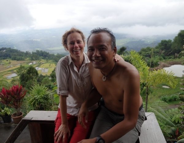 We klimmen behoorlijk tot we een stop maken bij een kleine warung voor een kom bamisoep. Aaaah..het uitzicht! Vanaf het balkon aan de achterzijde ligt de wereld aan onze voeten.(Zie foto, want een beschrijving doet hoe dan ook tekort aan wat we hier zien) Na ons hier te hebben vergaapt en de buik gevuld gaan we de straat af en de rijstvelden in. Dat is nog best lastig, want door de regen is het behoorlijk zompig en in no time staan we tot onze enkels in de modder. We glibberen en glijden en klimmen van sawa naar sawa en proberen de stortbui die we in de verte zien aankomen, voor te blijven. We voelen ons onhandige toeristen als een van de locals ons op blote voeten met gemak inhaalt en meelijdend aankijkt. We klauteren verder.