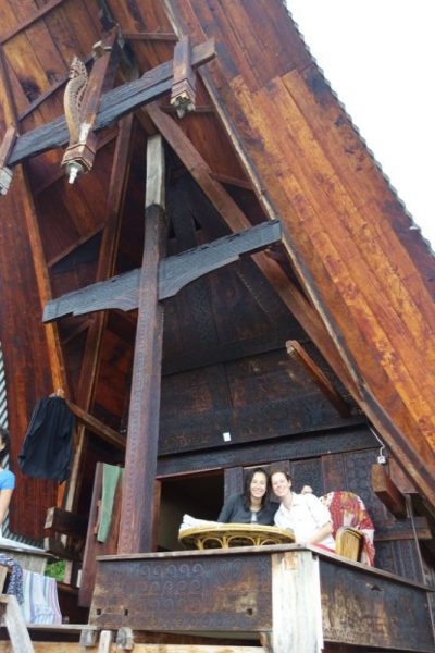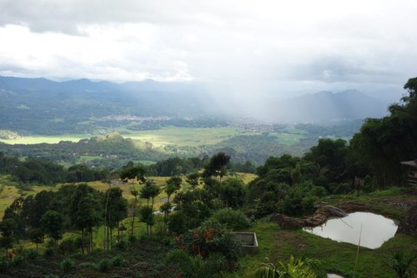 Als de eerste druppels vallen, staan we bijna bovenop de berg waar ook ons onderkomen voor vanacht staat. Een echt Torajahuis met een balkon en een uitzicht dat weer onwaarschijnlijk is, maar het bestaat en het is voor 1 nachtje ons huis. Het leven kan echt niet meer beter..
