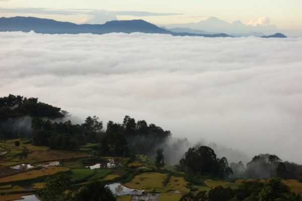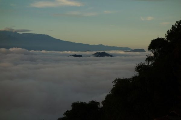 S’ochtends word ik wakker doordat mama vol ongeloof op het balkon naar buiten kijkt en naar binnen roept: ‘Waaaaauuwww, kom snel kijken! Wauwww, het is echt prachtig’. Het is half 7 s’ochtends en ik rol dus letterlijk mijn bed uit, vergetend dat de deuren zo laag zijn dat je ervoor moet bukken en ik stoot m’n neus tegen de deurpost. Dat doet pijn!!!! Papa en mama staan samen met Noa op het balkon en ze hebben mij niet gehoord. Ik snap nu ook waarom. Ik kijk over het balkon heen en ik vergeet de pijn aan m’n neus meteen. Het is prachtig, er ligt een wolkendek in de vallei, de sawa’s komen er een stukje bovenuit en een paar bergtoppen steken door de wolken heen. De opkomende zon strijkt met rood-oranje stralen over dit wolkendek heen, het is echt adembenemend.