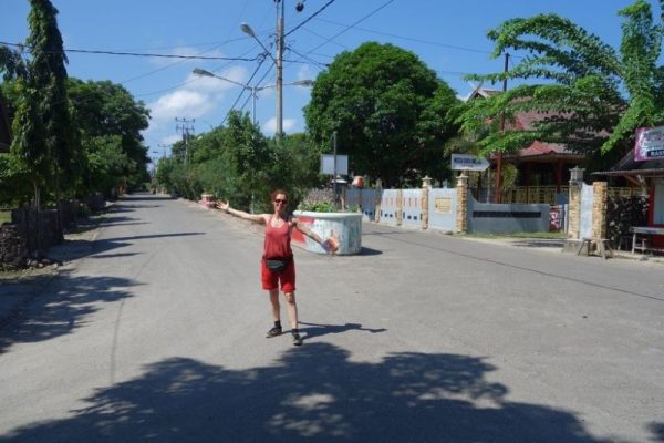 Na een rustige rit (… ja het kan dus ook rustig..), komen we net na de middag aan in Pantai Bira. Een soort badplaats, zeg Renesse, voor de locals en bewoners van Makassar…Kan heel druk zijn..vol met dagjesmensen. Vooral op zondag… Het is vandaag zondag!! Dus als de chauffeur stopt en wij niets anders zien dan welgeteld 1 geit en een kat met halve staart midden op de weg, vraag ik me af of we wel goed zitten. De plaats is uitgestorven, geen geluid, geen mensen, de stalletjes langs de weg zijn leeg en verlaten..