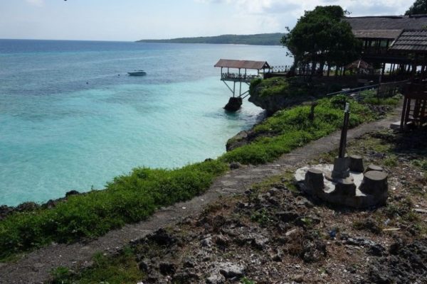 Er dobberen wel wat boten op het water. We besluiten eerst te eten en bekijken dan een paar kamers. We zien niet veel bijzonders. Het meeste is oud, vervallen, afgeleefd. Ik had gehoopt iets te vinden met uitzicht op zee voor onze laatste dagen in indonesie. Dan lopen we een terrein op waar huisjes op palen boven op een klif staan met uitzicht op zee. Lijkt verlaten. De meeste huisjes zijn kapot, gaten in het dak, rommel tussen de rotsen en straat vergaan.. Het was ooit vast heel mooi. Er zit 1 man op een stoepje bij de uitgang. Jerrel vraagt nog voor de zekerheid; ‘dicht, hè?’ Waarop een lui en traag ‘nee’ volgt. Even zijn we verbaasd, maar sjokken al gauw achter de man aan door de hitte, om de kamer/huisje te bekijken. Dit is leuuuuuuuk!!! We hoeven niet meer verder te kijken. Dit wordt gezellig. Met zijn vieren in een huisje, matrasje erbij en klaar. Er zit zelfs een echte wc in! En een airco!! Dat de douche stuk is, kan niet schelen. We zijn inmiddels sterren in scheppen met potjes, bakjes en emmertjes. Mandiën is ons ding, dus kom maar op met de sleutel. Binnen een paar minuten hangen de klamboes en zitten we in de bikini op het balkon. Zalig..