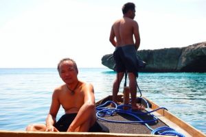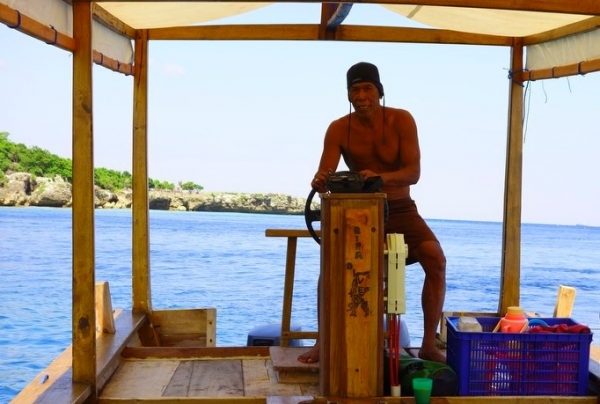 Wadend door het water bereiken we de boot waarmee we op snorkelpad gaan. Het zand is zacht aan onze voeten, maar de vele stukken oud en scherp koraal op de bodem maken het lastig om onze spullen droog aan boord te krijgen. Ik voel me wat onhandig als ik tot mijn oksels in het water, hinkelend bij de boot aankom en bijna door een golf omver word getrokken. Een beetje gegeneerd klim ik het laddertje op en neem plaats op de houten bank. De slippers die ik in mijn hand heb, zijn nog droog.