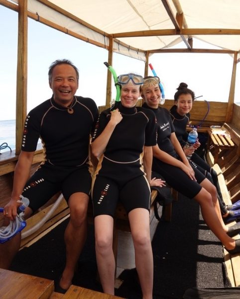 De kapitein is een iele man met een scherpe blik. Hij roept wat naar Diddy, de snorkelgids. Het anker word gelicht en daar zoeven we over het water. Gek, vanaf ons balkon leek de zee zo glad..gezichtsbedrog, voelen we al snel, want de golven zijn behoorlijk. Een beetje benauwd kijk ik over boord en hoop dat we ergens in de luwte van een baai of eiland gaan snorkelen, want de zee is ruw en de stroming lijkt fors. Gelukkig blijkt het nabij gelegen eiland inderdaad onze bestemming te zijn. De wetsuits gaan aan, de snorkels op en plons…wow,koud water!