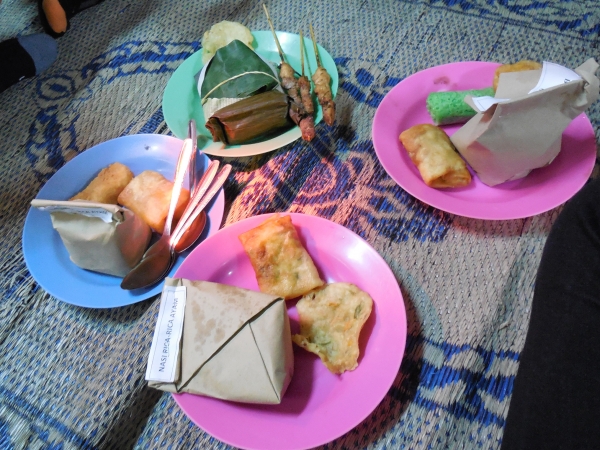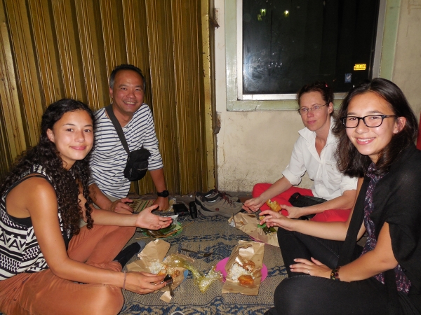 Eenmaal geland is het donker en begint het spel van uitchecken en vervoer vinden. Voor we het weten komen we aan bij ons hotel Ayla Nelendra. Rustig, schoon en mooi gelegen en vooral een eigen badkamer met warme douche… Toch wel lekker. We maken nog een wandeling door de hoofdstraat van het centrum. Overal is het druk. Winkels, stalletjes, betjaks (driewielige fietstaxies) en vooral veel verkeer dat zich door de straat wriemelt. Jerrels oog valt op een van de vele eetstalletjes langs de weg. We pakken een plastic bord, en scheppen wat vreemd ogende pakketjes, gefrituurde hapjes en in plastic gerolde groene dingen op ons bord, rekenen af (totaal voor 4 personen 23.000 Rupiah = Eur 1,80) en nemen plaats op een matje en eten net als de rest van de Indonesiërs gewoon op de grond terwijl het verkeer door toetert en voort ploetert.