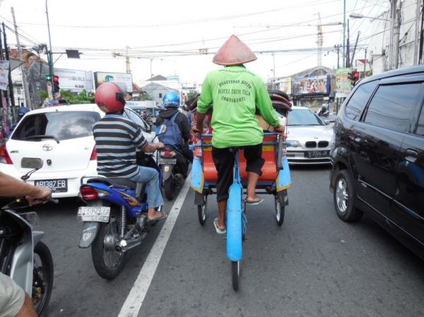 De eerste volle dag in Yogyakarta. Om 5 uur s’ ochtends klinkt de moskee..van 3 kanten! Gelukkig zijn we zo moe dat we er grotendeels doorheen slapen. Om 8 uur een ontbijt van fruit, rijst en toast en daarna hup, op verkenning. We lopen naar de hoofdstraat en vinden al gauw een betjak die ons naar het paleis wil brengen. Dat blijkt een flinke rit. Noa heeft er moeite mee, zo zielig voor die mannetjes…ze moet er haast van huilen. En gelijk heeft ze. De chauffeurs zijn zo oud en iel dat ze nauwelijks in staat lijken om op een fiets te stappen, laat staan twee passagiers te vervoeren. Maar schijn bedriegt. Ondanks een mond zonder tanden, blote voeten en grijs, dun haar, zijn ze fit en sterk, met de benen van een jonge vent. Ogenschijnlijk onvermoeibaar bewegen ze de betjak door het verkeer.