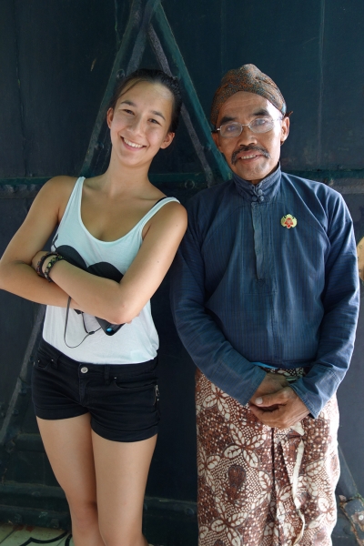 Nadat we een kaartje hadden gekocht, kregen we een strenge, bejaarde, Nederlands sprekende gids toegewezen. Een klein Javaans mannetje, gekleed in traditioneel kratonwachter klederdracht met een stoere kris achter op de rug. Het meest markante was zijn uitpuilende glazen linkeroog dat de andere kant uitkeek als hij tegen je sprak. Bij alle bijzonderheden gaf deze goede man een zeer uitgebreide toelichting in deftig ABN, waarbij hij steeds van de hak op de tak sprong. Hij had bovendien nog maar een paar tanden in zijn mond en was daardoor heel moeilijk te verstaan. Die man wist zo ontzettend veel … hij was echt een lopende encyclopedie!