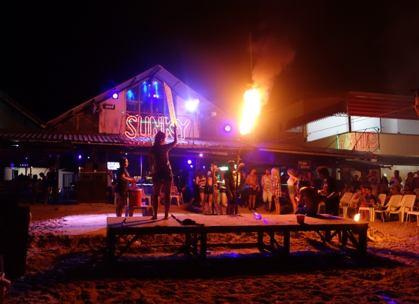 De restaurantjes lopen dan langzaam vol. Op het strand zijn vuurshows en er klinkt harde techno-house muziek vanaf de barretjes. In het centrum spelen enkele live bandjes bekende hits. Het publiek zingt luidkeels mee, steeds harder naarmate de avond vordert en het bier en de cocktails vloeien. Noa en ik vermaken ons prima en zingen in volle borst mee.