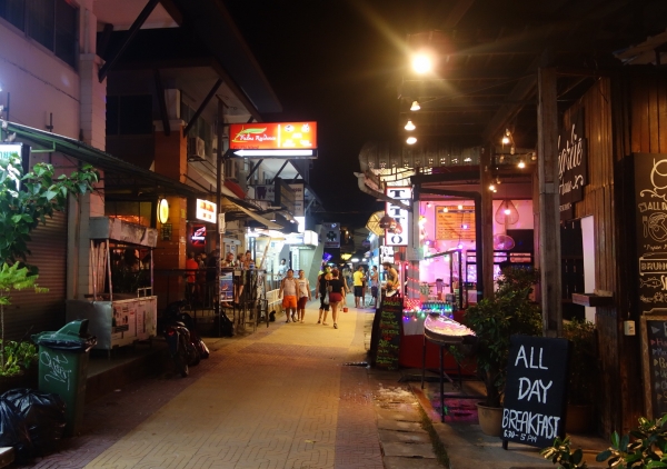 Ook zien we veel daytrippers die vanuit Phuket, Krabi of andere eilanden een kort bezoekje brengen aan Koh Phi Phi. Ze komen, kijken wat rond en vertrekken dan weer. Telkens als er een boot in de haven aankomt, is het eventjes een drukte van jewelste. Overdag merken wij niet zo veel van de vele toeristen, waarschijnlijk ook omdat het nog geen hoogseizoen is. Maar ’s avonds en in de nachtelijke uren komt Koh Phi Phi pas echt tot leven. Iedereen kruipt uit zijn holletje… Uitgeslapen, terug van het duiken, het snorkelen, het kajakken of eilandtoeren… het nachtleven kan beginnen.