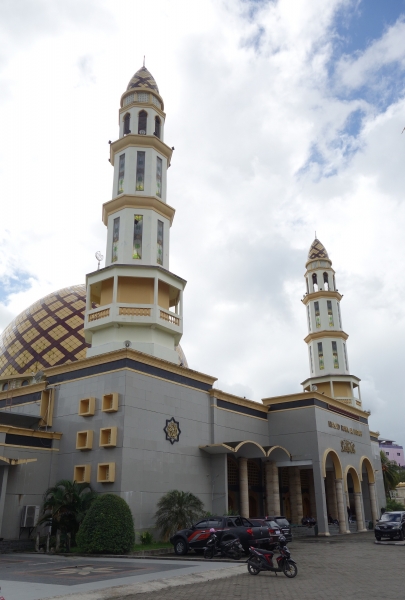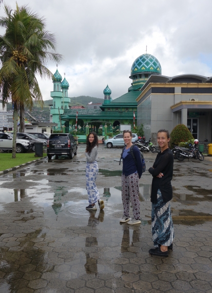 Het is 30 graden, en er is weinig wind. Ambon ligt beschut, waardoor de hitte meer voelbaar is dan op de eilanden, waar we regelmatig met een vest rondliepen. Zelfs de 300 meter van het museum naar een busje maakt ons verhit en zweterig.Terug in het centrum bezoeken we de Al Fatah moskee en de kleinere An Nur moskee ernaast. Yara, Noa en ik kleden ons aan, want de moskee is in onze toeristenoutfit niet toegankelijk. We trekken een vest over onze shirts en een sarong over onze korte broeken en krijgen direct bewondering voor al die vrouwen in hun sluiers en hoofddoeken. Het zweet loopt over onze ruggen, nog voordat we de trap van de moskee betreden. Overal zitten en liggen mannen op de vloeren.