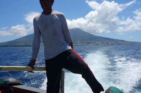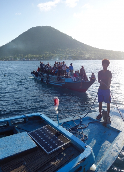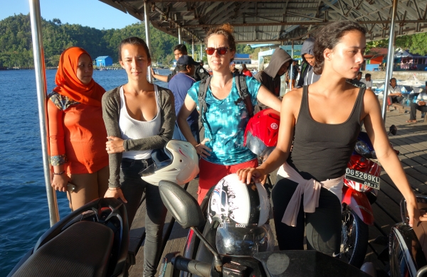 We huren we voor een tweede dag scooters en rijden, na een stevig ontbijt richting haven in Ternate. We mogen van de havenmeester zonder te betalen doorrijden naar de boot. Achteraf komen we erachter dat je eerst een toegangsticket tot de haven koopt en separaat de overtocht betaalt aan de kapitein van de boot. De scooters worden op het dak van de boot getild en met touwen vastgezet. De passagiers gaan aan boord en gaan zitten daar waar plaats is: in de cabine eronder, op het voordek, het achterdek of op het dak. Er wordt niet gewerkt met tijdschema’s. De boot vertrekt pas als er genoeg passagiers zijn.