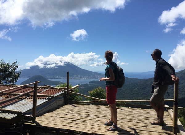 We gaan van boord en besluiten om rechtsom het eiland te rijden op weg naar het hooggelegen Lada Ake, onze eerste bestemming. Van daaruit heb je mooi uitzicht is ons verteld. Onderweg vragen we een paar keer de weg, want het enige dat we weten is dat het een nieuwe weg is en hoe het dorpje heet (als we het al goed uitspreken). En dat gaat mis, we zijn halverwege de berg als er onverwacht hulp komt. Drie jongens op scooters seinen dat we ze moeten volgen. Later blijkt dat ze ons de hele dag escorteren. Even later zijn het er ineens vier. Onze 4 musketiers. Na een behoorlijke stijle klim stranden we. Mijn scooter trekt de zware klim niet en raakt oververhit. Gelukkig is daar het uitzichtpunt en het is inderdaad schitterend. De beide vulkanen van Ternate en Maitara zijn te zien met bewolking rond de top.