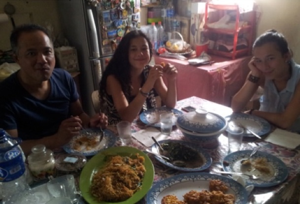Daar staan we dan op het vliegveld van Jakarta. We verwachten opgehaald te worden door papa’s nichtje Vivi en haar man, Hennie. Maar er staat buiten niemand. Althans… we waren elkaar misgelopen. We drinken even een kopje thee en zoeken alle vier een lekkere donut uit. Ondertussen probeert papa zijn nicht te bereiken. En een paar minuten later staat Hennie te wachten voor zijn auto. We stappen in de auto. De airco word aangezet en Yara, mama en ik vallen met zijn drieën op de achterbank in slaap. In een uurtje zijn we bij tante Annie’s huis, de oudste zus van oma Thea. We lopen de trap met zijn allen op en verwachten een klein appartement. De deur gaat open en een onverwachts mega groot appartement verschijnt voor onze ogen. Het is erg warm en vochtig, en we zijn allemaal dood op. Het is inmiddels al half 2. We drinken allemaal een ijskoud glaasje water en dan ploffen we allemaal op ons bed. Zo sliepen we tot 4 uur.
