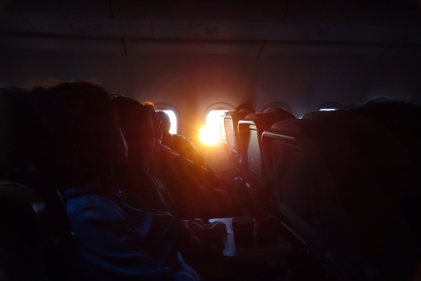 Het is nu 00.49 uur Nederlandse tijd. We vliegen op 11.887 meter hoogte ergens tussen Bukarest en Ankara in. Rond kwart voor 4 zijn we bepakt en bezakt naar station Arnhem-Zuid gelopen en hebben om de trein naar Schiphol te pakken. 4 gloednieuwe rugzakken die hun eerste meters maakten. Een mooi plaatje …