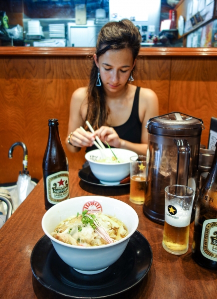 We gaan vanavond voor de okonomiyaki, een mix van noedels, groentes, vis of vlees en kruiden dat als een pannenkoek dubbel wordt gebakken. Heel lekker… vooral met een ijskoud biertje erbij. Na ons avondmaal lopen we via de drukke hoofdstaat terug naar ons appartement.