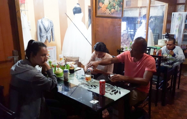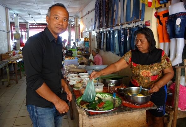 Om de hitte het hoofd te bieden, eten we een lekker ijsje en slenteren nog wat over het marktje bij ons hotel. We kopen wat kleefrijst en ander lekkers en gaan op het terras van het hotel een potje rikken (Jerrel staat nog steeds mijlenver op ons voor). In de avond gaan we op zoek naar een eethuisje. We kiezen rumah makan (eethuis) Erna. Grappig detail is dat de helft van het eethuis de plaatselijke bruidszaak is. We zitten aan onze soto ayam en gado-gado naast een raam met daarachter de bruidsjurken. Een leuk einde van een mooie dag.