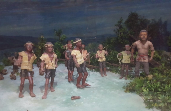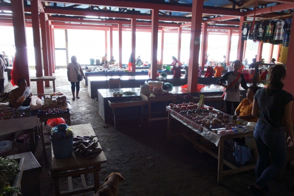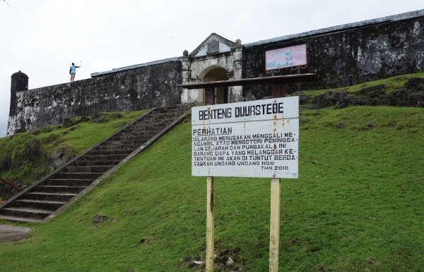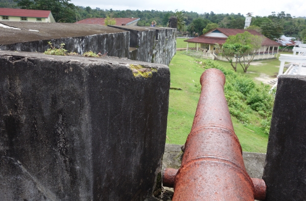 We maken de overtocht en staan binnen een uur in Haria op het eiland Saparua en niet veel later checken we in bij hotel Mandiri. Eenvoudig en redelijk schoon. Zaterdag is marktdag. Omdat we zo vroeg aan zijn gekomen, lopen we eerst wat rond op de markt dat pal naast t hotel ligt aansluitend maken we een wandeling door het dorp en bekijken Fort Duurstede. Het is mooi gerestaureerd en ligt op een mooie plek in de baai. De zon staat echter hoog aan de hemel en het is er ook zo heet, dat we het niet lang volhouden zonder beschutting. We lopen van schaduwplek, naar schaduwplek en zijn blij als we even kunnen schuilen in het tegenoverliggende museum. Hier is heel beeldend m.b.v. diorama’s de historie van het verzet tegen de Nederlanders tentoongesteld.
