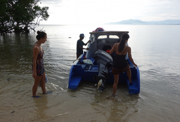De boot arriveert om 7.00 uur stipt. De kapitein en zijn navigator gebaren ons om in te stappen. Uhh … we zijn weliswaar met vijf passagiers (Kathy gaat mee), maar de boot lijkt me wel een beetje aan de kleine kant om zo ver de zee op te gaan. Als dat maar goed gaat! We lopen vanuit ons strandje het water in en gaan 1 voor 1 aan boord. We verdelen ons gewicht zo gelijkmatig mogelijk, zodat de boot niet te veel naar 1 kant helt. Wat me verder direct opvalt, is dat er maar twee reddingsvesten liggen… voor de bemanning zelf, vermoed ik. Ik probeer er niet aan te denken dat het mis zou kunnen gaan.