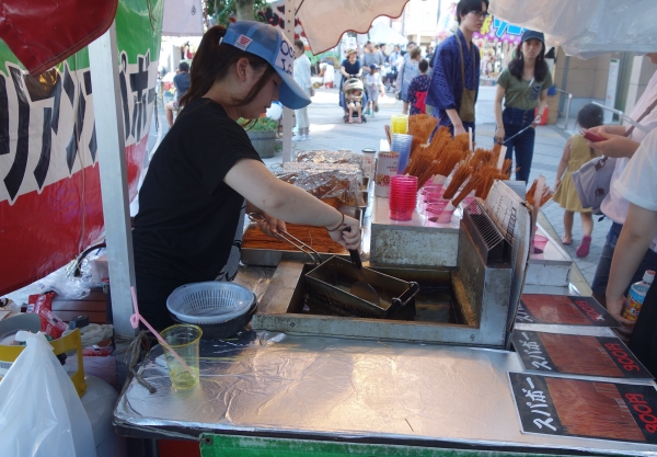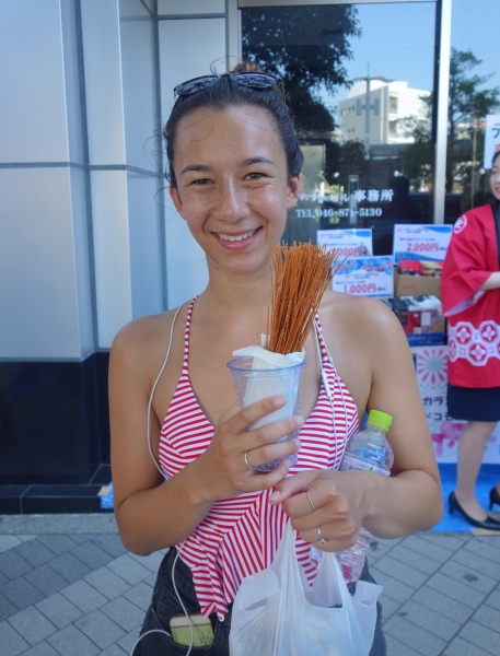 De felle zon brandt op onze huid, maar door de heerlijke aanlandige wind is het goed toeven aan het strand. We houden het na drie uurtjes echter, voor gezien en gaan terug naar het hotel, waar we rond vijven aankomen. In het centrum van Zushi lopen we nog tegen een braderie aan met allerlei marktkraampjes en een podium. We kopen er wat snacks en pikken op de valreep nog een voorstelling van een drumgroep mee.