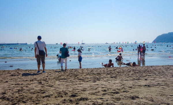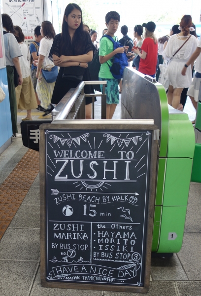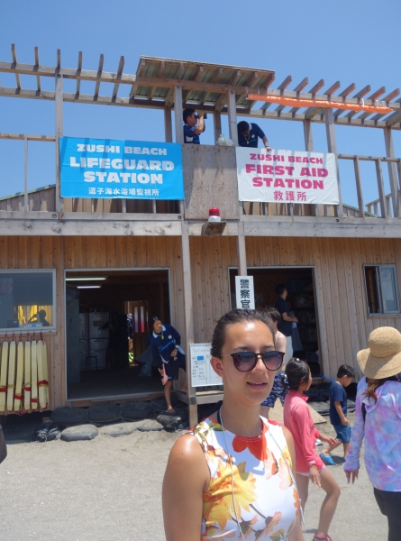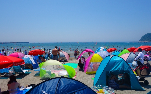 Tokyo ligt niet direct aan de open zee, maar in een baai met meerdere stranden. Zushi Beach ligt op een klein uurtje afstand met de JR trein uur, inclusief 10 minuten lopen vanuit het station. Het blijkt een populair uitstapje, want als wij bij het strand aankomen, zien we een op elkaar gepropte mensenmassa voor ons. Het merendeel van de mensen schuilt onder en parasol of strandtent. We zien wel degelijk ook Japanse zonaanbidders bakken in de volle zon, dus ons vooroordeel dat alle Japanners de zon mijden om blank te blijven, klopt niet… Myth Busted dus!